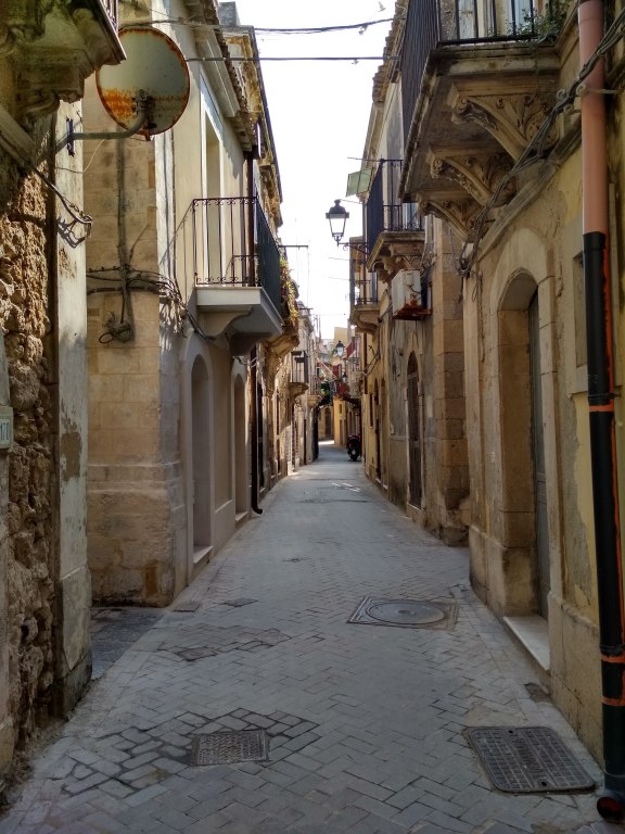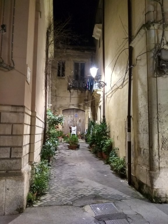 Pomimo ciepłego wieczoru uliczki są opustoszałe a na sporej ilości knajp wywieszone tabliczki „ferie”. Skąpe oświetlenie nastraja iście bajkowym klimatem. Wyobraźnia pracuje. Pozostawiamy sobie sporą dozę niedosytu. Jutro Ortigia będzie smakować równie dobrze. Równie dobrze jak dzisiejsza kolacja. Kupujemy proste składniki: makaron, ser, pomidory, bułki. Z wielkiej beli mortadeli z pistacjami sprzedawca kroi 6 plastrów. Są tak wielkie, że można byłoby sobie z nich zrobić mortadelową maskę na twarz. Na balkonie obserwujemy cichnącą powoli ulicę Via Caltanissetta. Idziemy spać. W przeciwieństwie do Katanii panuje to cisza jak w wygłuszonym studiu nagraniowym. W nocy budzą nas kilka razy odgłosy skrzypiących drzwi. Opcje są dwie. Albo duchy albo efekt wina.