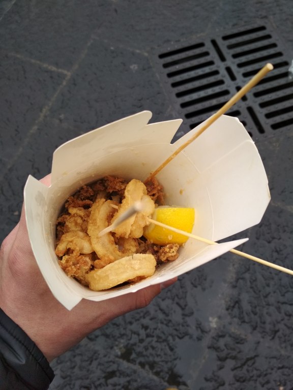 Trafiamy na Piazza Alonzo di Benedetto. Miejsce na które warto się udać będąc w Katanii. Niewielki, ale niezwykle klimatyczny targ rybny, gdzie czerwona rybia krew komponuje się z czarnym brukiem kamienia wulkanicznego. Handlarze nie mówią, nie krzyczą, ale niemal śpiewająco zachwalają swoje towary. Scirocco Sicilian Fish Lab mały i niepozorny bar. Przekąski w postaci smażonych krążków kalmarów, ośmiornicy, sardeli i krewetek, podane w papierowym rożku z kawałkiem cytryny i jebitną wykałaczką (7 euro). Tłuste, kaloryczne i DOBRE.