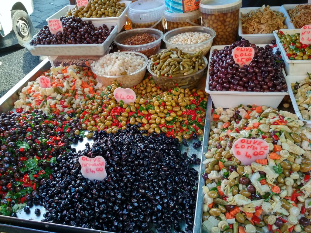 Rano jeszcze przed poranna kawką, jakby wiedziony zapachem świeżego pieczywa lecę do małej piekarenki na rogu Via Grotte Blanche i Via Capuana. Jestem w rozpiętej kurtce i koszulce na krótki rękaw. Sympatyczna sycyjska babuszka wymownym gestem pyta czy nie jest mi nie zimno, po czym kroi i wręcza mi w gratisie kawałek czekoladowego ciasta. Biorę zapas migdałowych ciastek i brioches. Lekko zbaczam z kursu i zachodzę na rynek, gdzie na jednym ze straganów mrugają do mnie zalotnie wielkie zielone oliwki. Biorę pół kilo.